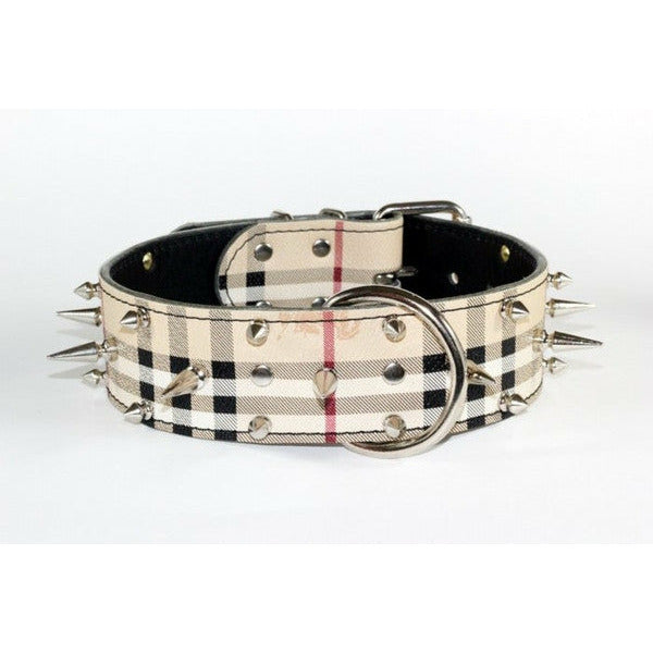 Handmade with great quality leather, this Classic Plaid leather dog collar is definitely eye catching. The Classic Plaid material is sewn securely on top of black 10 oz latigo leather. The spikes and hardware are installed securely by heavy pounding and/or screwed thru the leather. Pitbull Spiked Leather Plaid Dog Collar