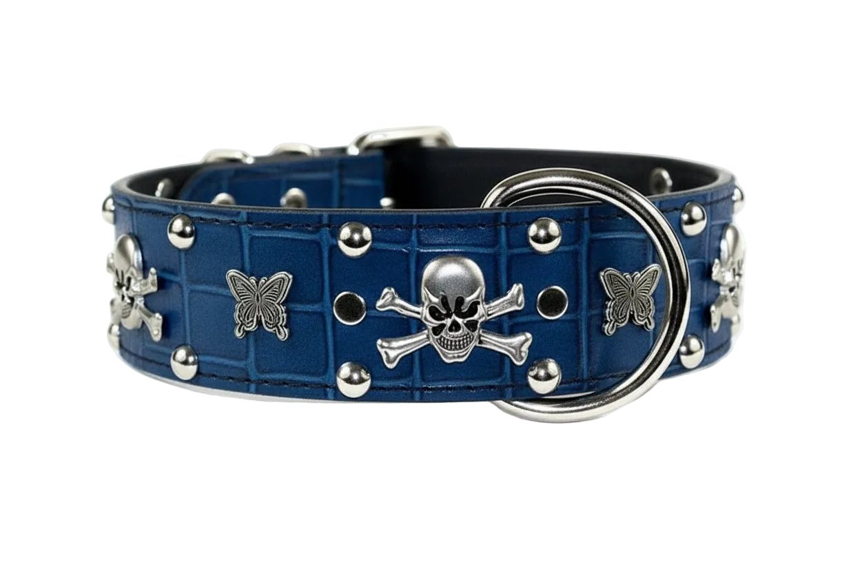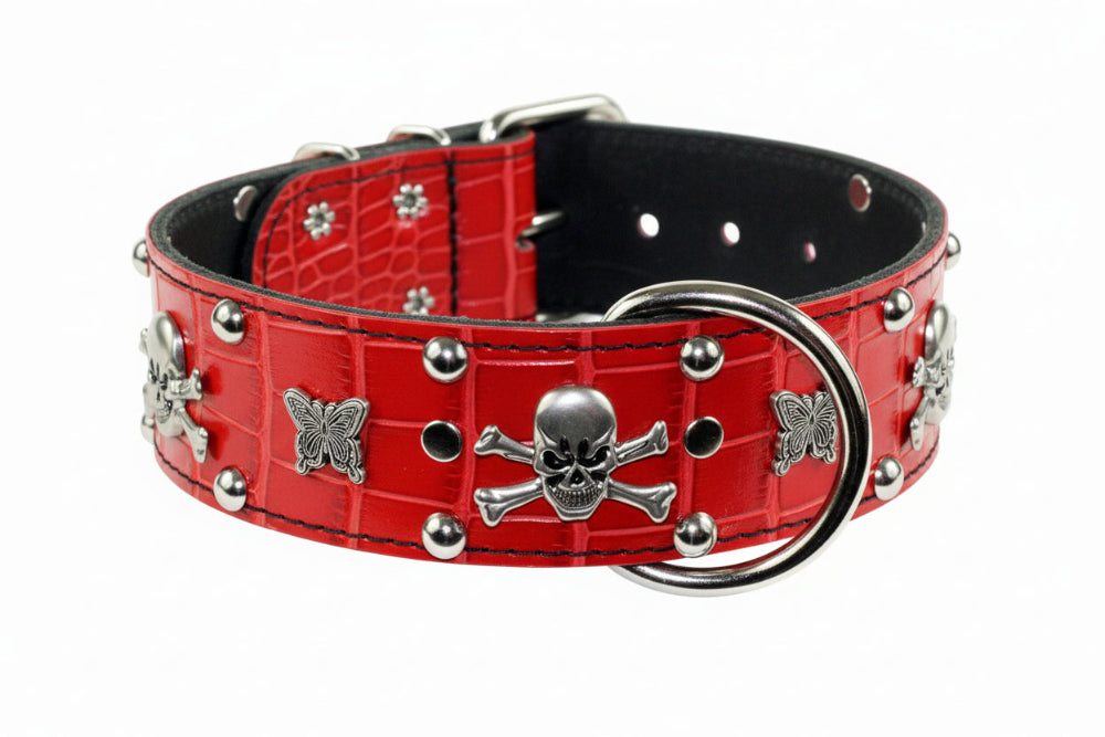 Make a bold statement with the Red Croc Skull & Crossbones Leather Dog Collar – a handcrafted collar featuring red croc-embossed leather, skull and crossbones conchos, and chrome studs. This premium collar combines edgy style with rugged durability for dogs who command attention.